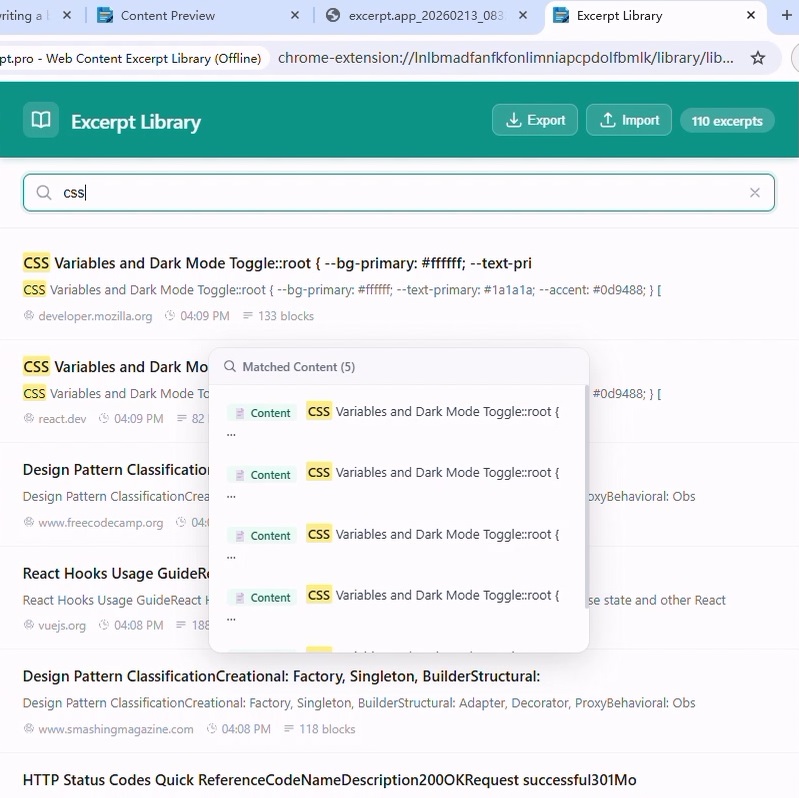 Your saved excerpts live inside your browser. Search instantly by keyword. No syncing. No external storage.