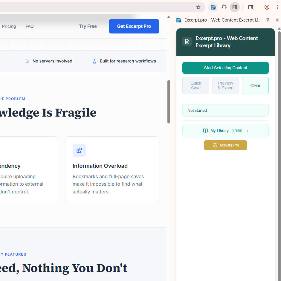 You can still use Excerpt to capture content and export distraction-free PDFs to your local folders as much as you like. However, the internal Local Library storage and search features are capped at 100 items. To continue building your permanent, searchable archive within the browser, you’ll need to upgrade to Excerpt Pro.